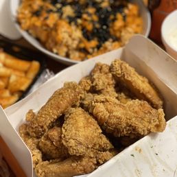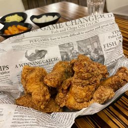We had a really long day of errand runs. We were in the Fort Lee area originally and wanted some Korean fried chicken. We tried a very popular place but they had a 1 hour wait time. We were a bit too famished, so we searched for another Korean chicken place and landed ourselves here. Glad we did. Spacey, clean, cute decor, pleasant service, moderately fast food to table. We tried the half chicken- spicy soy garlic, sweet and spicy wings and soy garlic wings with fries. The fries were really good, not average. A good high quality crisp to it. All the chicken we had was very delicious. The chicken wings are good quality, cooked well and the sauces are absolutely delicious. They put an assortment of things before the meal. 2 ketchup, spicy rice cake, pickled radish, and a yolky coleslaw. Service was good but nothing that stood out. I will definitely be back for more wings, coleslaw and fries.